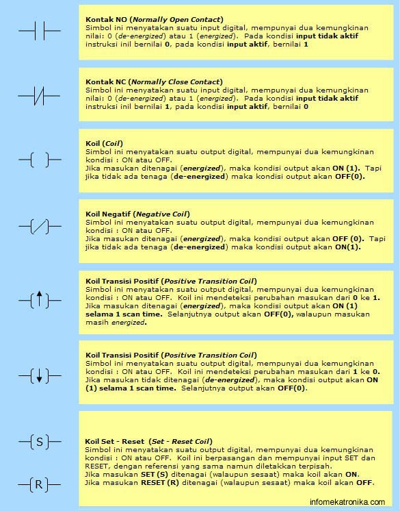 | Jika Anda ingin mempelajari lebih dalam tentang pemrograman PLC merk tertentu, Anda wajib membaca buku manualnya tentang bagaimana cara memprogram. Jangan selalu menyamakan satu merk PLC dengan PLC merk lain ! |
