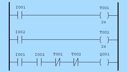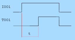Jika I001 bekerja, maka dua detik kemudian T001 aktif. Jika I001 mati, T001 juga mati.