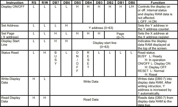 Satu unit display dikendalikan oleh dua kontroller, masing-masing mengatur 64x64 pixel. Alokasi memori masing-masing kontroller dibagi menjadi 8 page dari page 0 sampai page 7. Masing-masing page memuat 64 byte (64 x 8 bit).