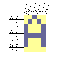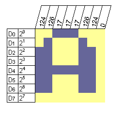 Ada dua macam ukuran karakter yang digunakan, yaitu ukuran 8x8 pixel dan 8x5 pixel. Setiap karakter dibentuk dengan memberi angka biner 8 bit pada jalan masuk D0 ... D7 dan di kunci (latched) dengan memberi pulsa sesaat pada pena enable. Pada gambar 9 dijelaskan cara membentuk huruf "A". Setiap kolom berisi 8 bit dengan nilai sesuai dengan titik yang menyala. Untuk karakter 8x8 pixel diperlukan sebanyak 8 byte dan karakter 8x5 pixel diperlukan 5 byte (1 byte = 8 bit). Byte pertama bernilai 124, karena titik yang menyala terletak pada D2, D3, D4, D5, dan D6.